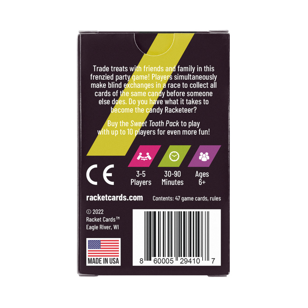 Trade treats with friends and family in this frenzied party game! Players simultaneously make blind exchanges in a race to collect all cards of the same candy before someone else does. Do you have what it takes to become the candy Racketeer?