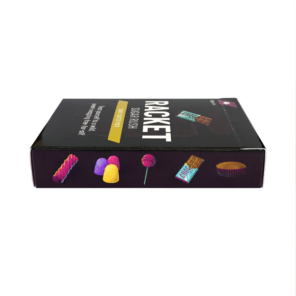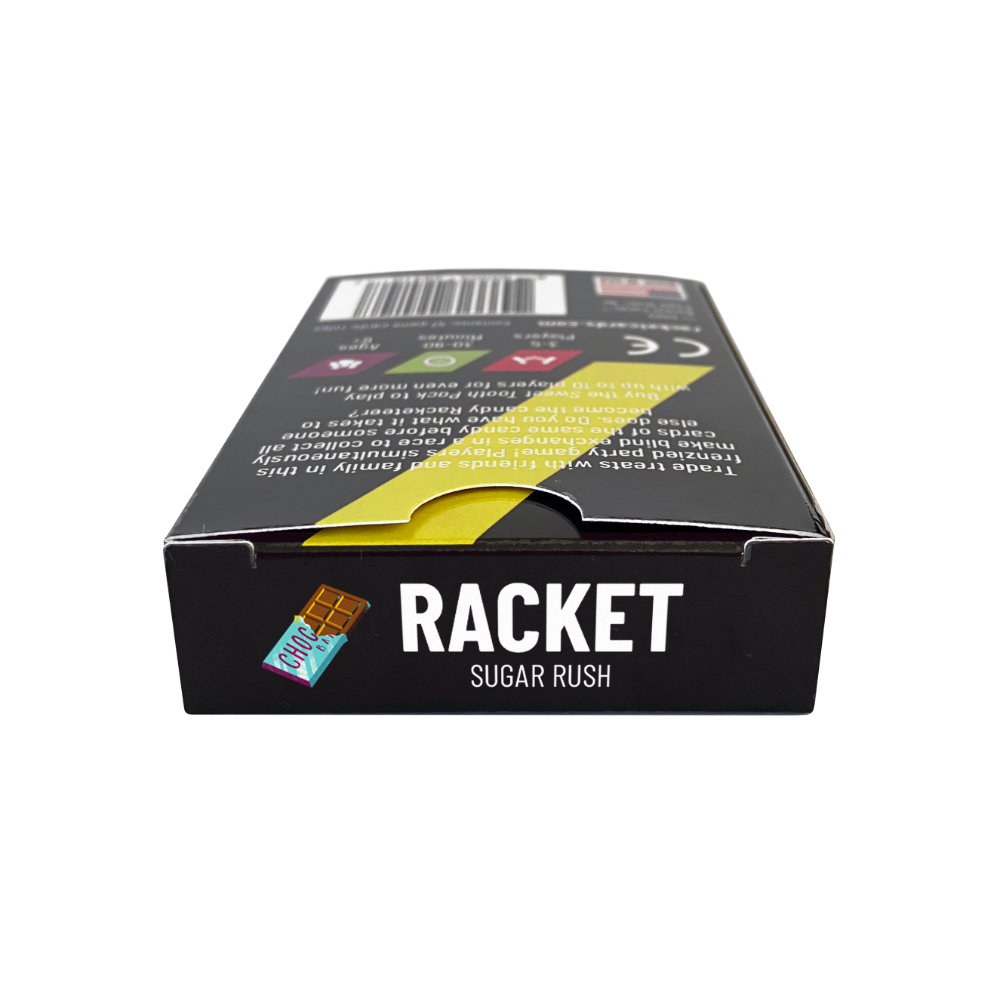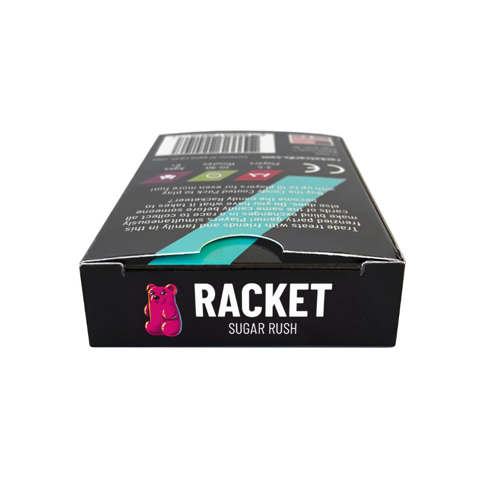 Racket: Sugar Rush is a real-time, tabletop party game where all players play together simultaneously, making for fast-paced and frantic gameplay with equal parts strategy and chance. Your objective is to become the candy racketeer by being the first player to total 50 points over several rounds of play. All players will be dealt a handful of randomly shuffled candy cards to begin each round. You will then make blind trades with opponents in an attempt to collect all cards of the same candy before someone else does.