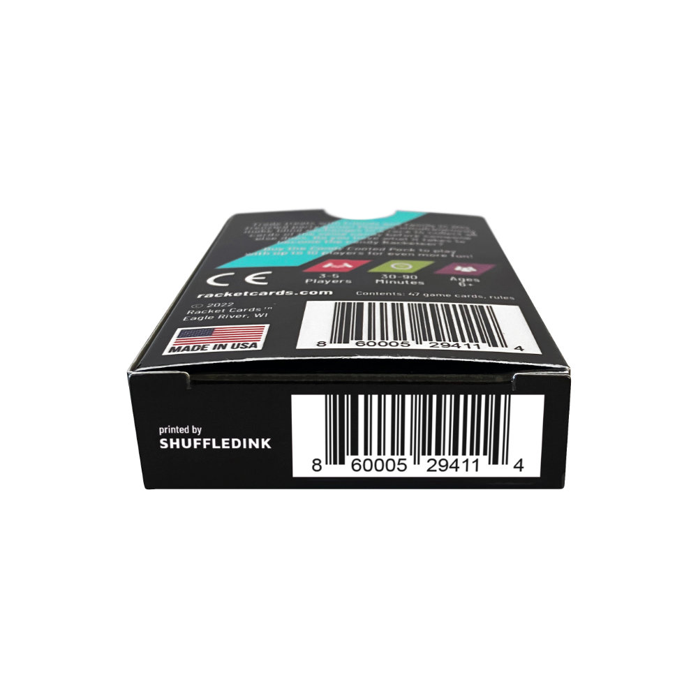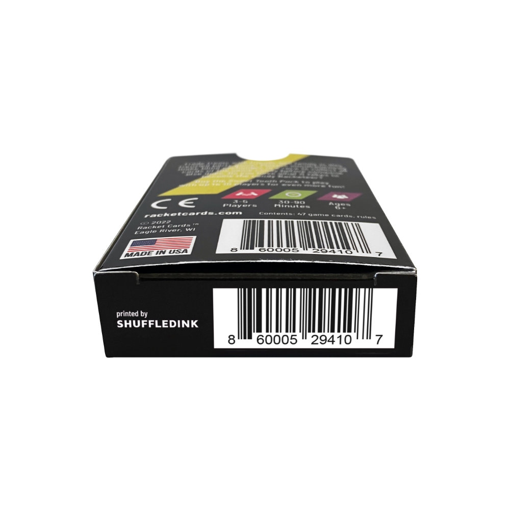 Each Racket deck contains 47 cards — 45 candy cards, a Candy Jar card and a Dentist card. There are 5 different types of candy cards with 9 cards of each type per deck. One pack of Racket cards can allow for game play of 3 to 5 players. For game play of up to 10 players combine both decks.